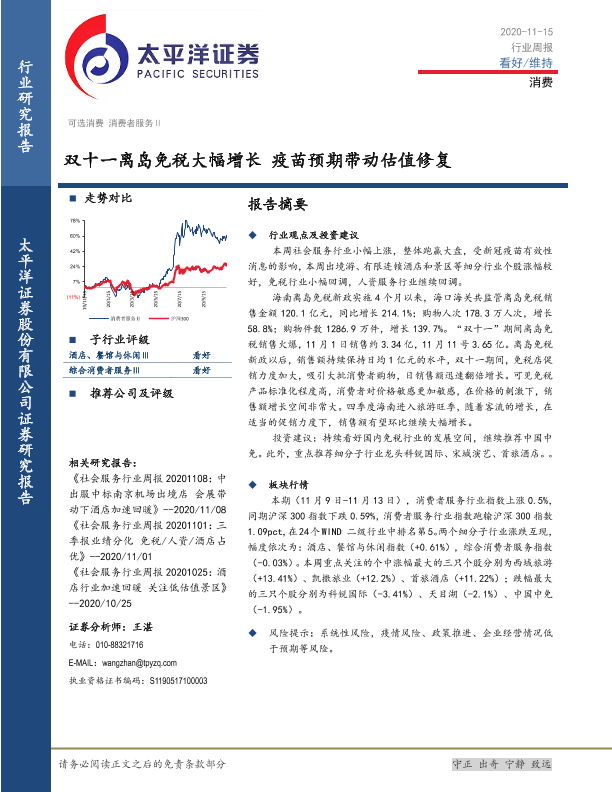 【太平洋证券】【20201115】消费行业周报:双十一离岛免税大幅增长 疫苗预期带动估值修复-13页