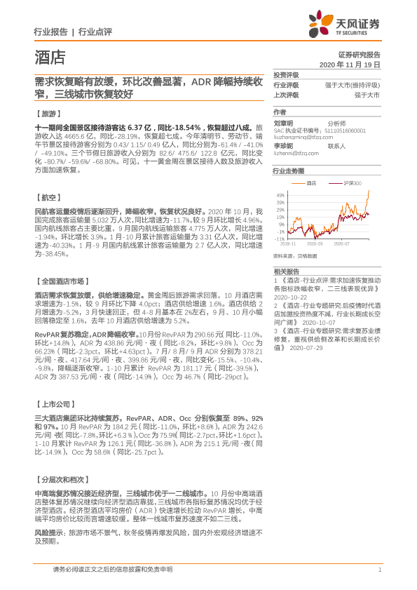 【天风证券】【20201119】酒店:需求恢复略有放缓,环比改善显著,ADR降幅持续收窄,三线城市恢复较好-6页