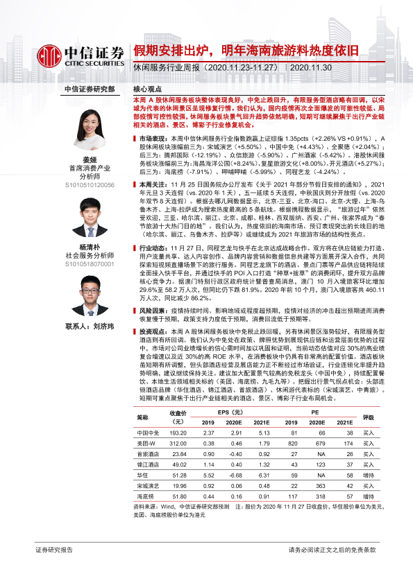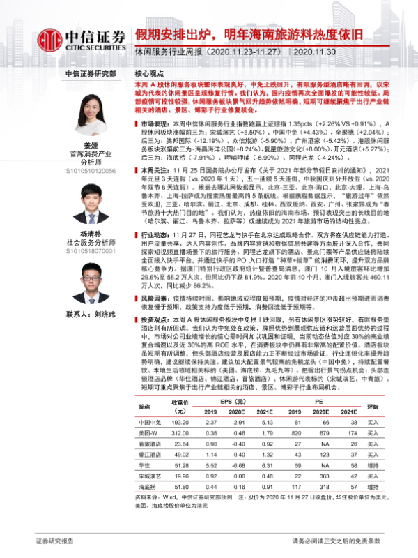 【中信证券】【20201130】休闲服务行业周报:假期安排出炉,明年海南旅游料热度依旧-13页