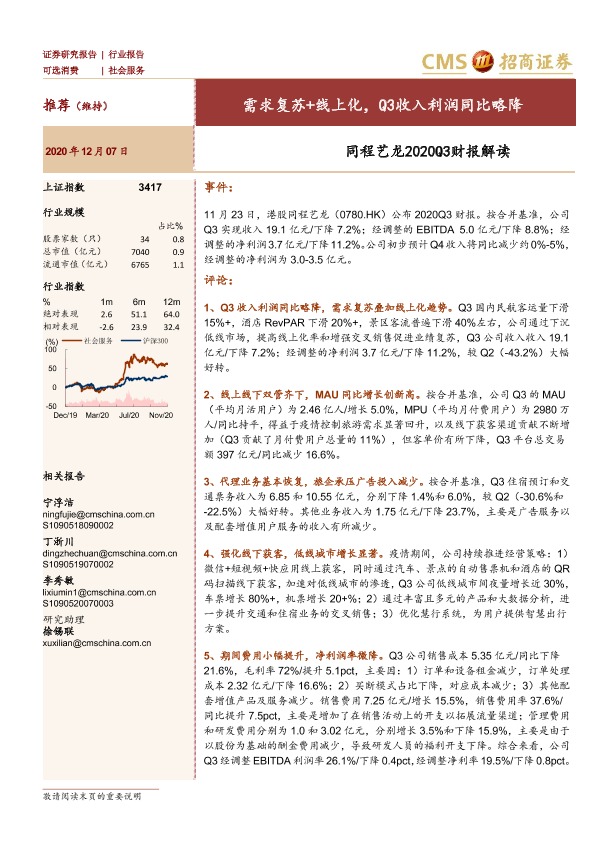 【海通证券】【20201207】社会服务:同程艺龙2020Q3财报解读-需求复苏+线上化,Q3收入利润同比略降-4页