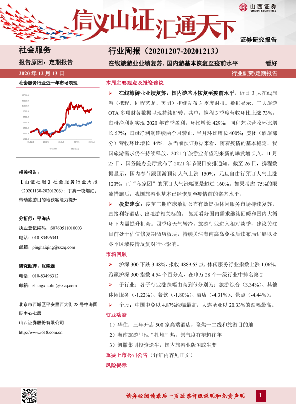 【山西证券】【20201213】社会服务行业周报:在线旅游业业绩复苏,国内游基本恢复至疫前水平-9页