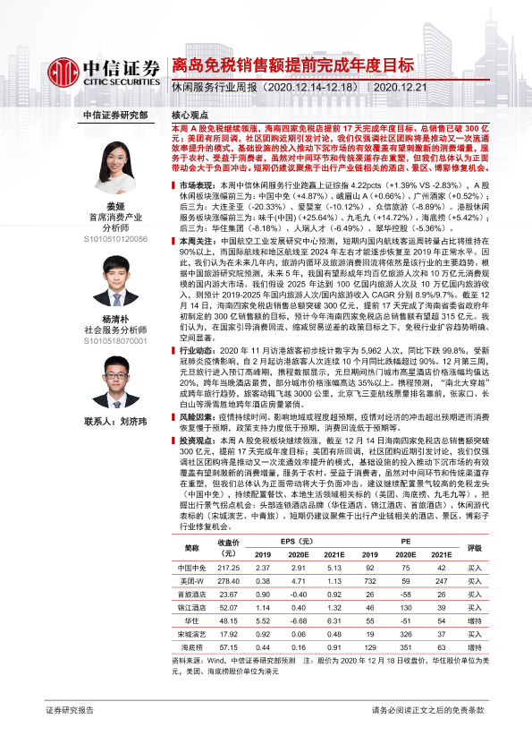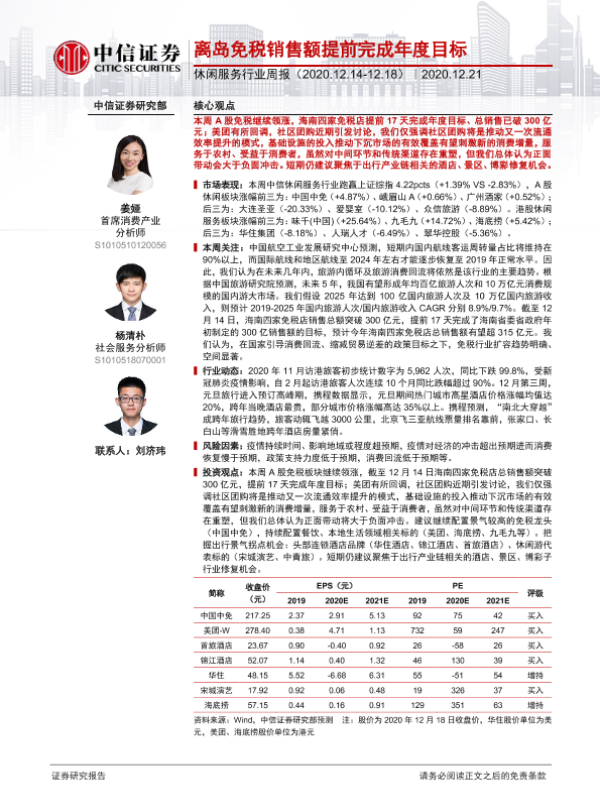 【中信证券】【20201221】休闲服务行业周报:离岛免税销售额提前完成年度目标-13页