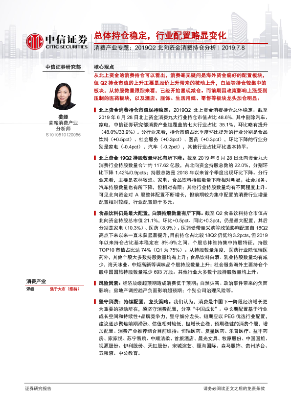 【中信证券】【20190708】2019Q2北向资金消费持仓分析:总体持仓稳定,行业配置略显变化-6页