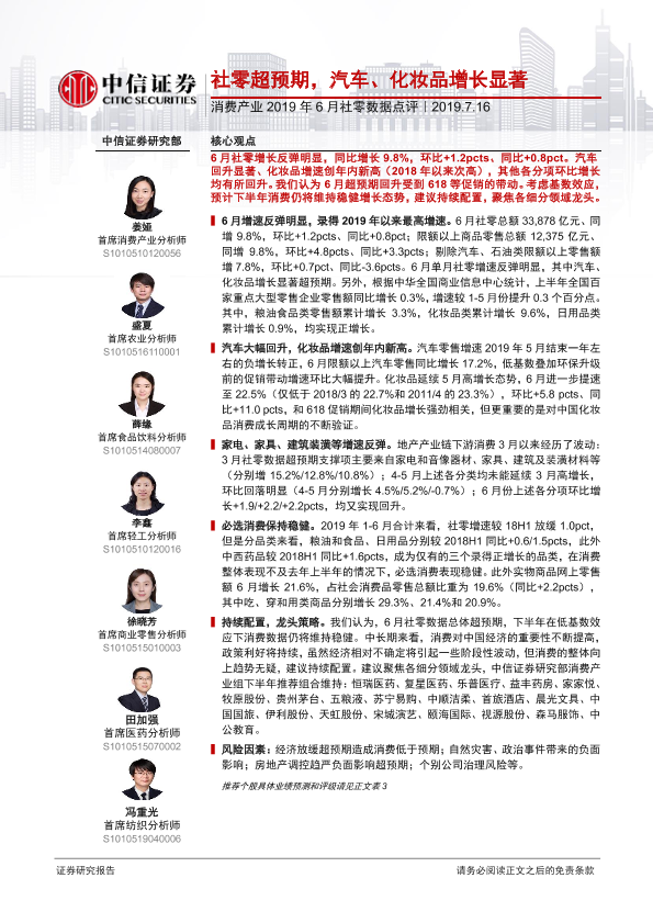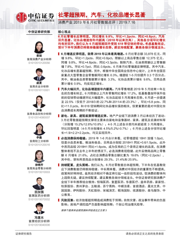 【中信证券】【20190716】2019年6月社零数据点评:社零超预期,汽车、化妆品增长显著-5页