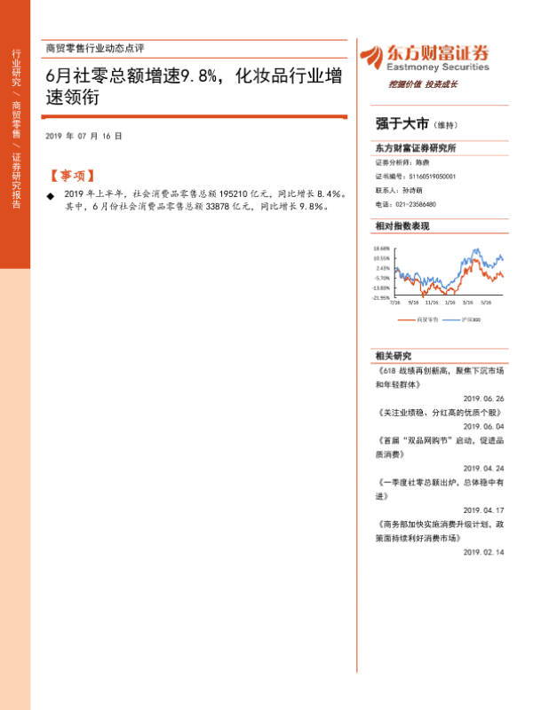 【东方财富证券】【20190716】6月社零总额增速9.8%,化妆品行业增速领衔-3页