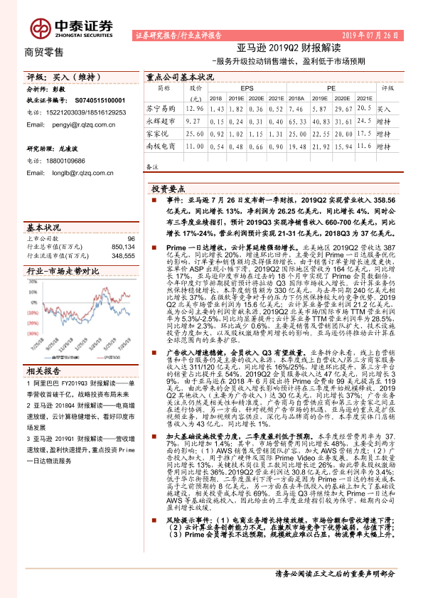 【中泰证券】【20190726】亚马逊2019Q2财报解读:服务升级拉动销售增长,盈利低于市场预期-5页