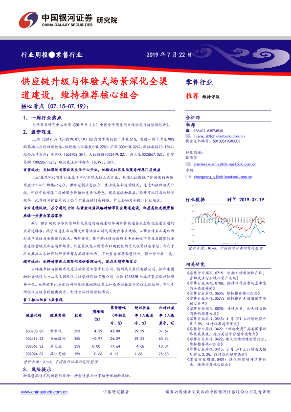 【银河证券】【20190722】零售行业周报:供应链升级与体验式场景深化全渠道建设-30页