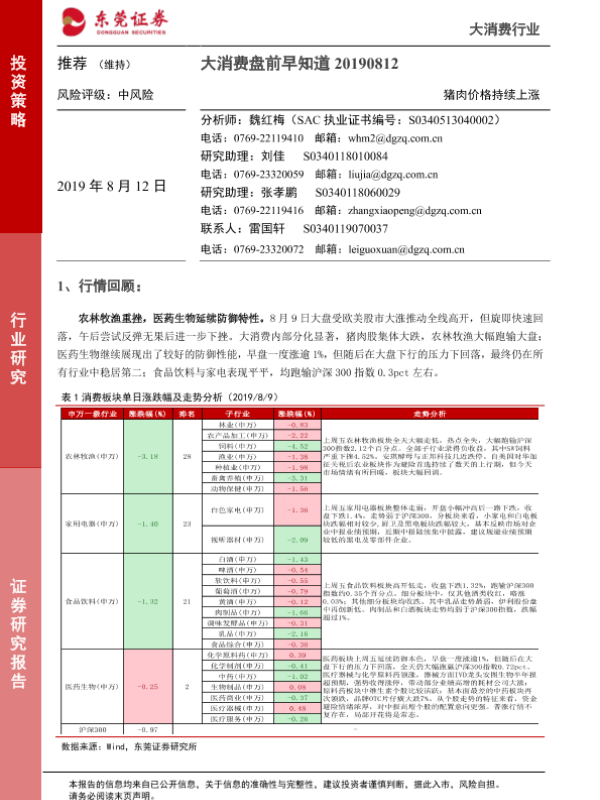 【东莞证券】【20190812】大消费盘前早知道:猪肉价格持续上涨-7页