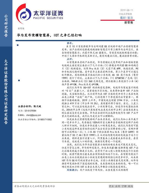 【太平洋证券】【20190811】新零售:华为发布荣耀智慧屏,IOT之争已经打响-4页
