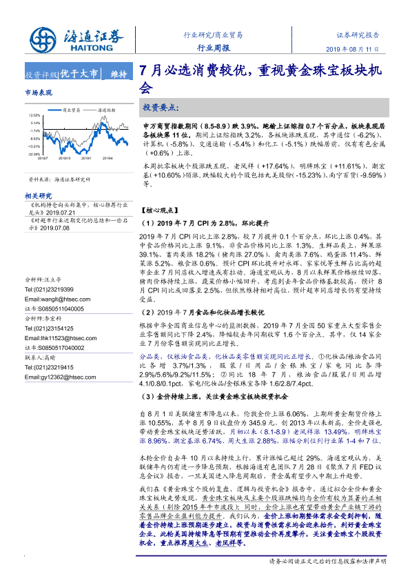 【海通证券】【20190811】7月必选消费较优,重视黄金珠宝板块机会-6页