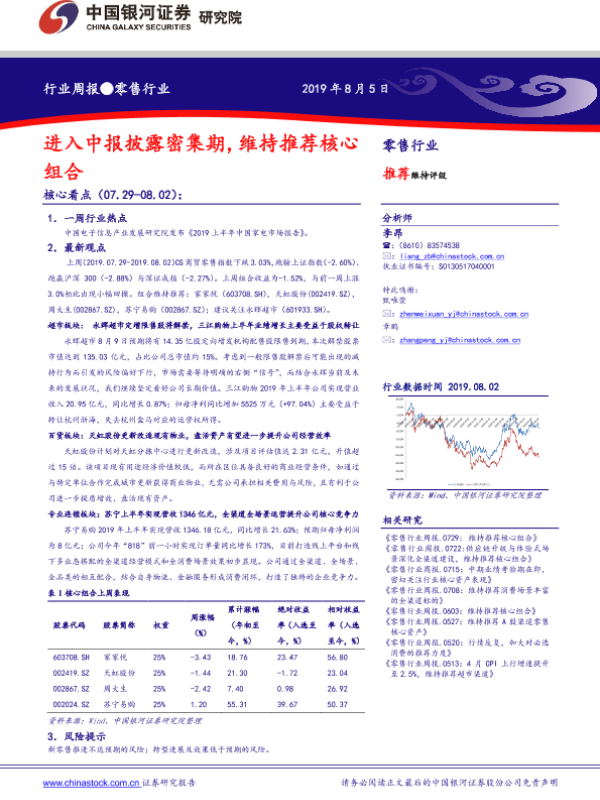 【银河证券】【20190805】零售行业周报:进入中报披露密集期,维持推荐核心组合-30页