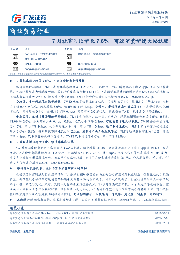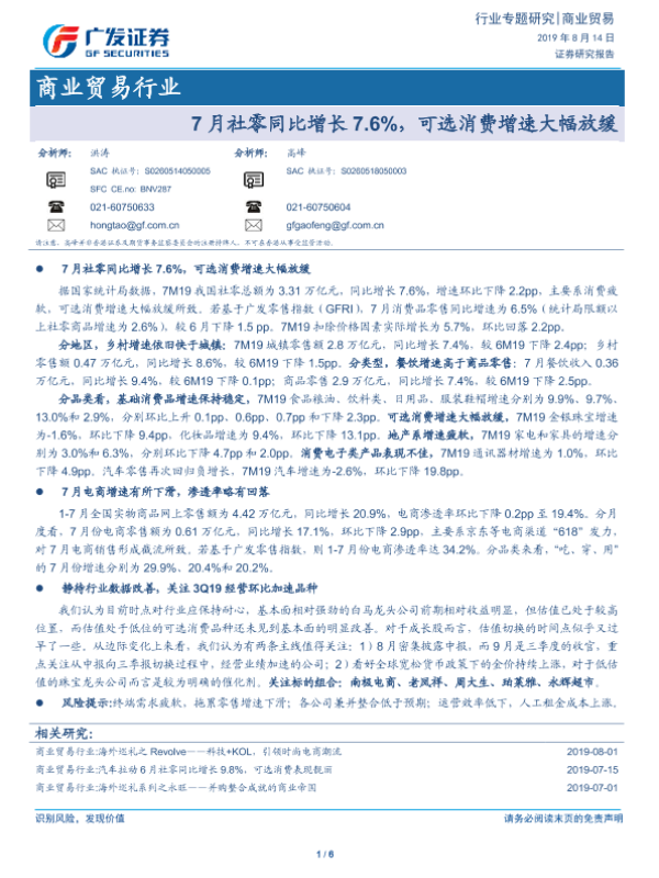【广发证券】【20190814】7月社零同比增长7.6%,可选消费增速大幅放缓-6页