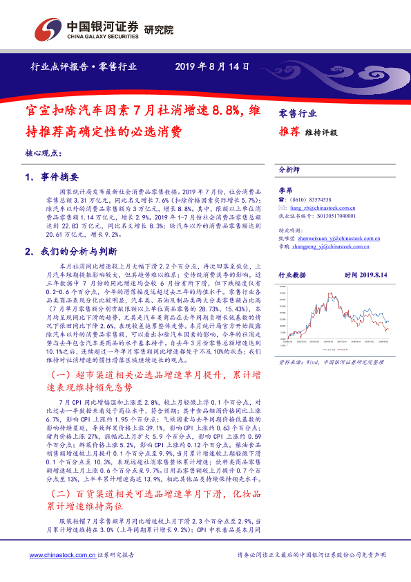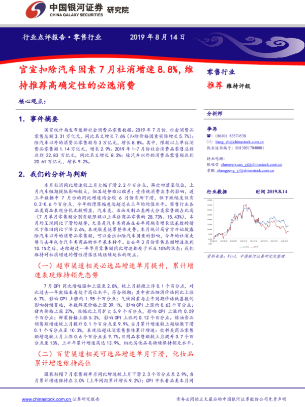 【银河证券】【20190814】零售行业点评报告:官宣扣除汽车因素7月社消增速8.8%,维持推荐高确定性的必选消费-4页