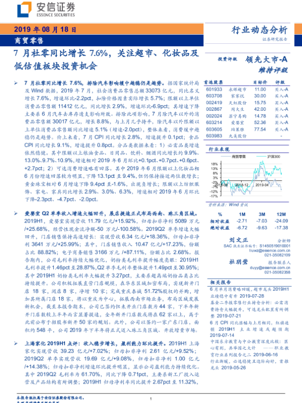 【安信证券】【20190818】7月社零同比增长7.6%,关注超市、化妆品及低估值板块投资机会-24页