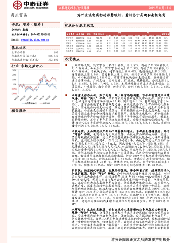 【中泰证券】【20190818】商业贸易行业周报:海外主流电商标的涨势较好,看好苏宁易购和南极电商-17页