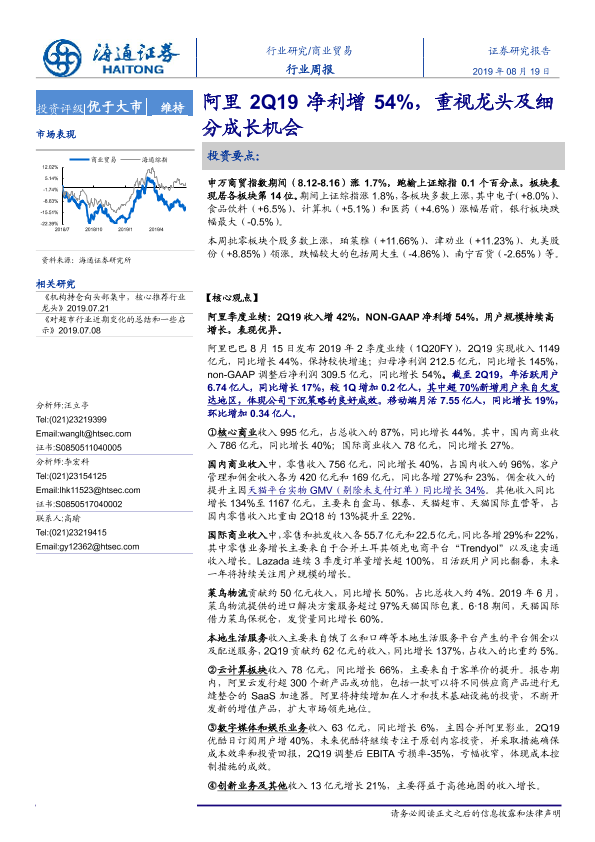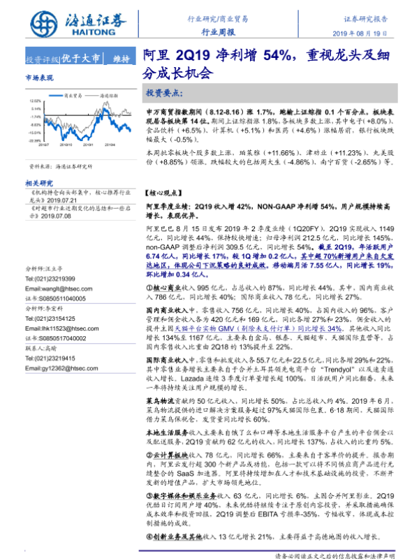 【海通证券】【20190819】商业贸易行业周报:阿里2Q19净利增54%,重视龙头及细分成长机会-6页