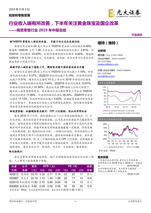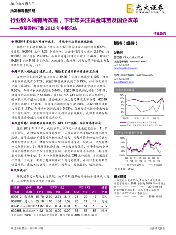 【光大证券】【20190903】商贸零售行业2019年中报总结:行业收入端有所改善,下半年关注黄金珠宝及国企改革-22页