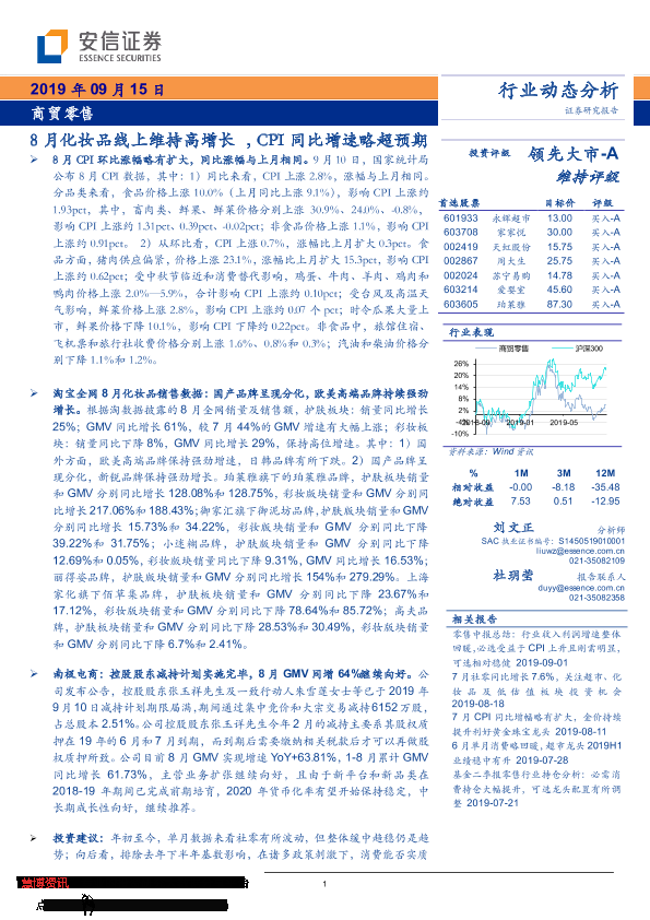 【安信证券】【20190915】8月化妆品线上维持高增长,CPI同比增速略超预期-16页
