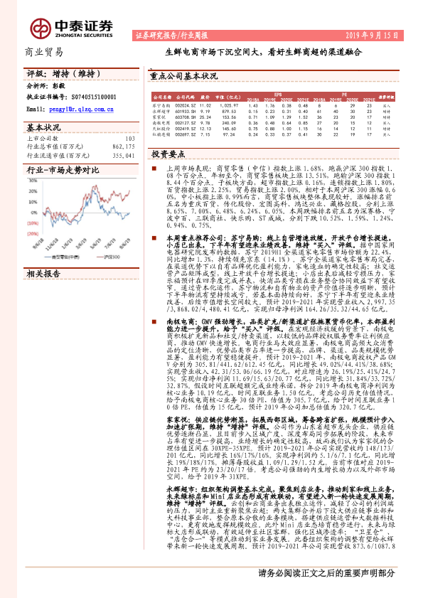 商业贸易 市场下沉 渠道融合 生鲜电商 行业周报