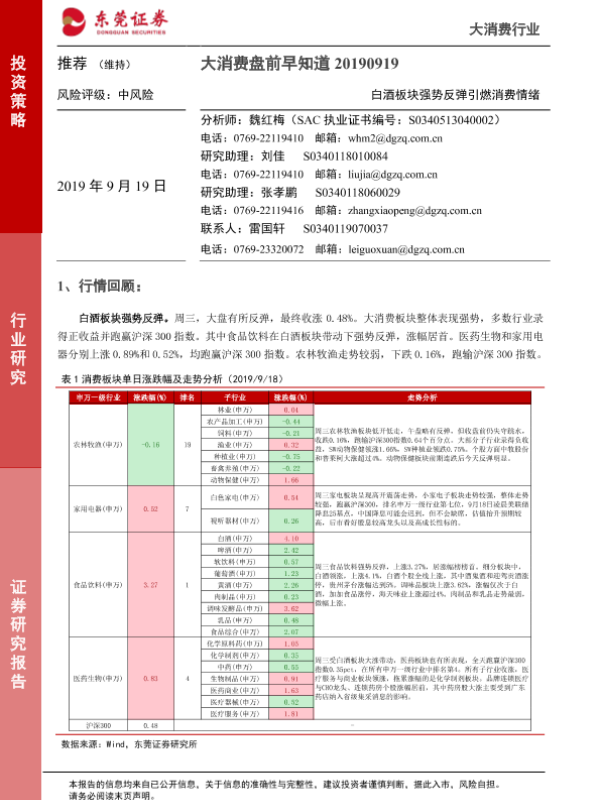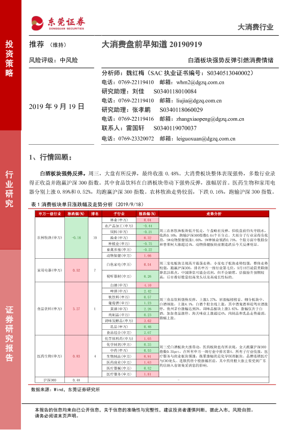 【东莞证券】【20190919】大消费盘前早知道:白酒板块强势反弹引燃消费情绪-5页