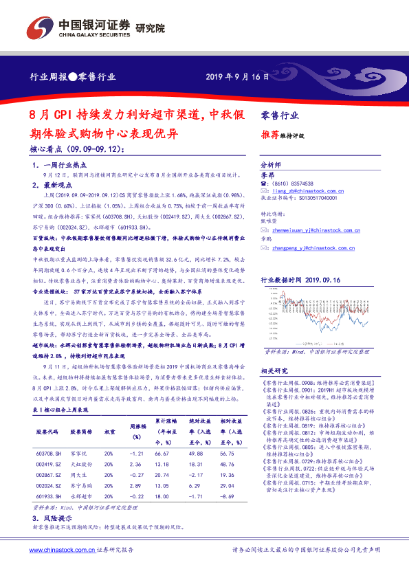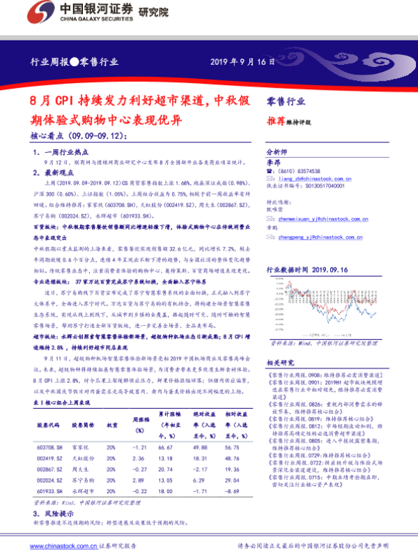 【银河证券】【20190916】8月CPI持续发力利好超市渠道,中秋假期体验式购物中心表现优异-30页