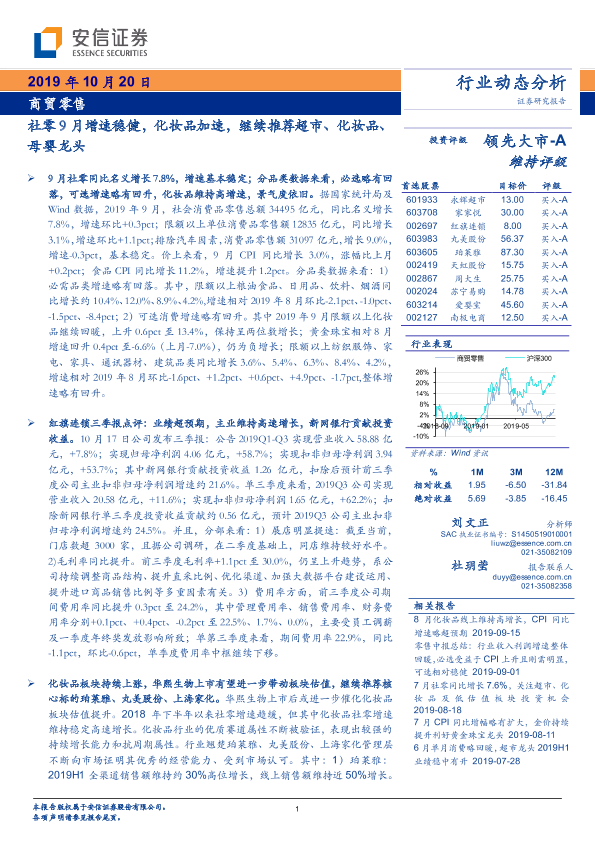 【安信证券】【20191020】商贸零售行业动态分析:社零9月增速稳健,化妆品加速,继续推荐超市、化妆品、母婴龙头-27页