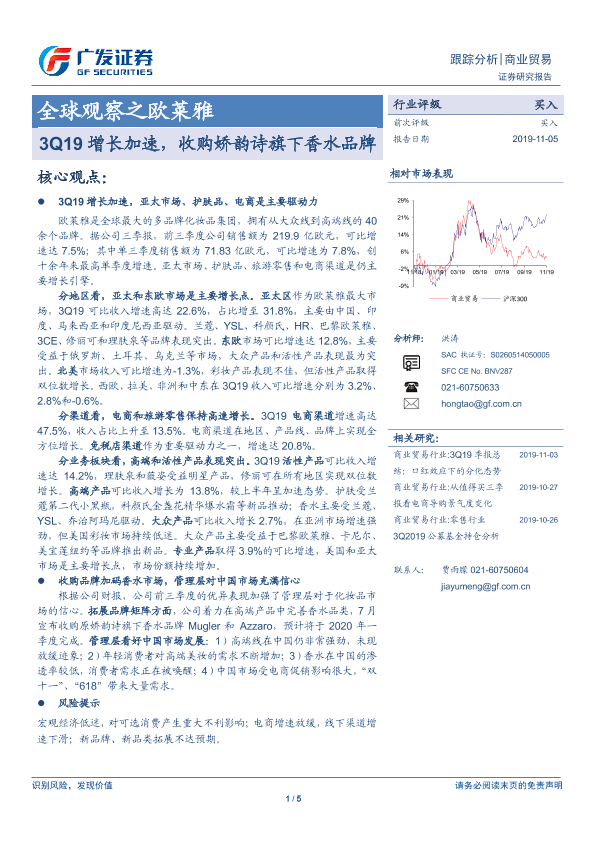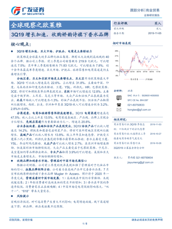 【广发证券】【20191105】全球观察之欧莱雅-3Q19增长加速,收购娇韵诗旗下香水品牌-5页