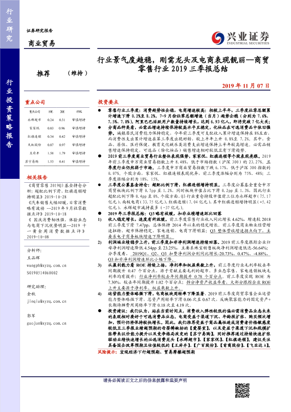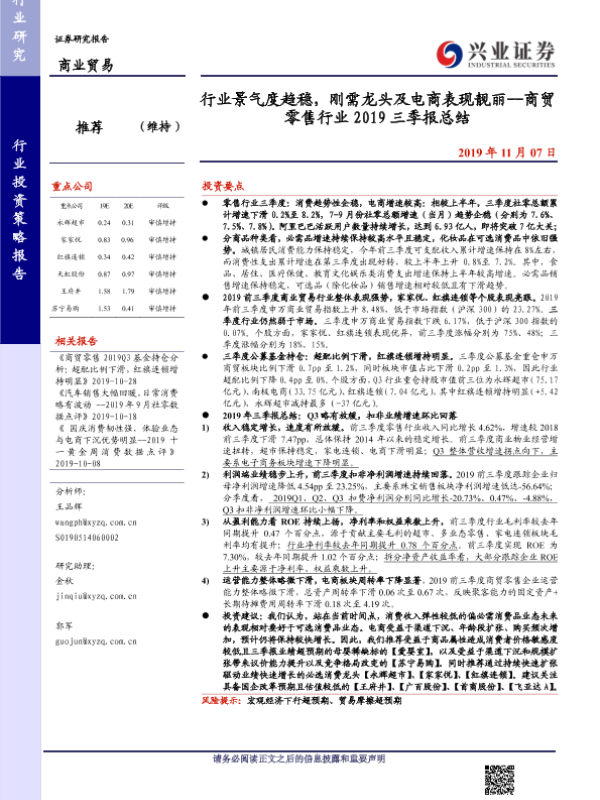 【兴业证券】【20191107】商贸零售行业2019三季报总结:行业景气度趋稳,刚需龙头及电商表现靓丽-29页