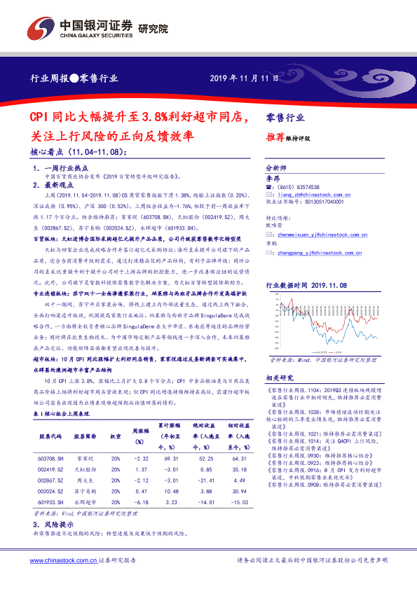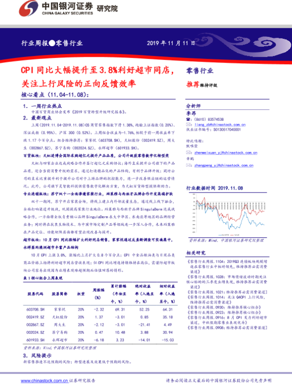 【银河证券】【20191111】零售行业周报:CPI同比大幅提升至3.8%利好超市同店,关注上行风险的正向反馈效率-30页