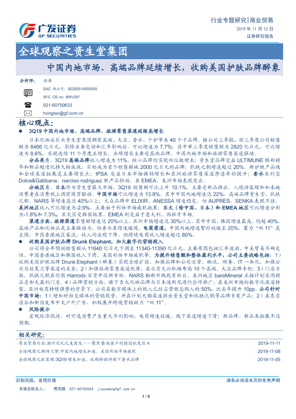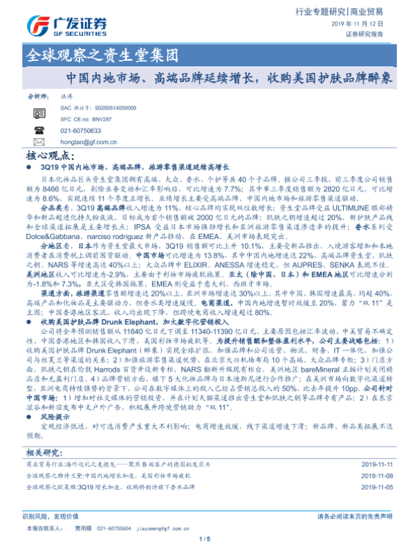 【广发证券】【20191112】全球观察之资生堂集团:中国内地市场、高端品牌延续增长,收购美国护肤品牌醉象-5页