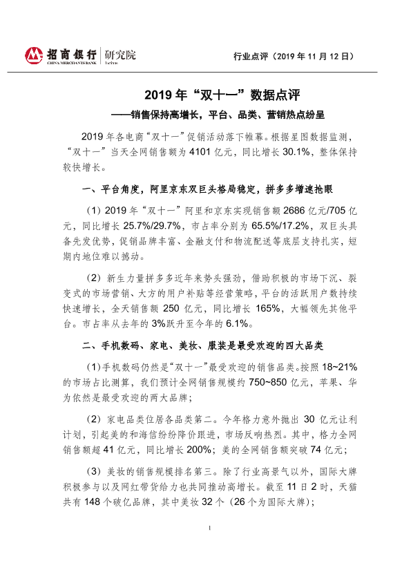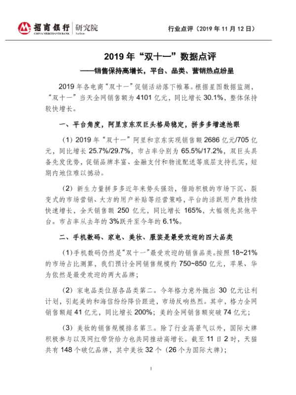 【招商银行】【20191112】电商行业2019年“双十一”数据点评:销售保持高增长,平台、品类、营销热点纷呈-3页