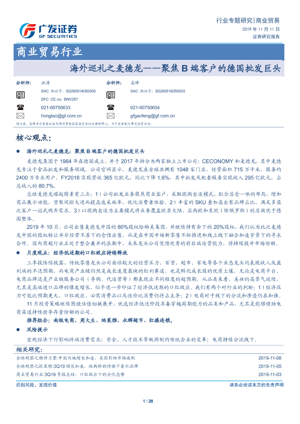 【广发证券】【20191111】海外巡礼之麦德龙——聚焦B端客户的德国批发巨头-28页