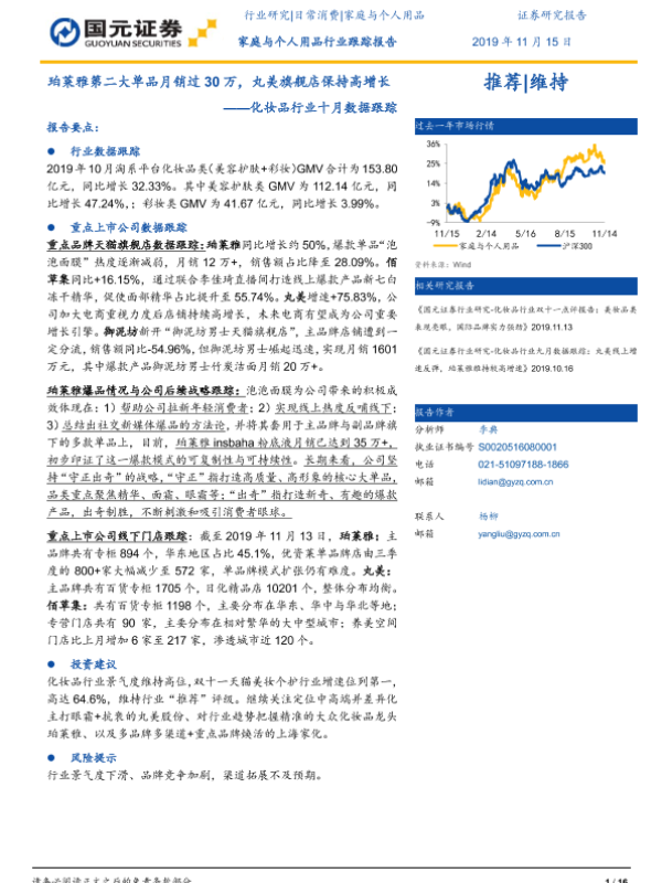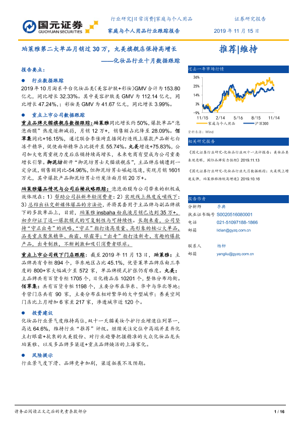 【国元证券】【20191115】化妆品行业十月数据跟踪:珀莱雅第二大单品月销过30万,丸美旗舰店保持高增长-16页