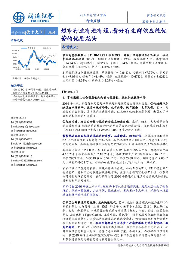 【海通证券】【20191124】商业贸易行业周报:超市行业有进有退,看好有生鲜供应链优势的优质龙头-6页