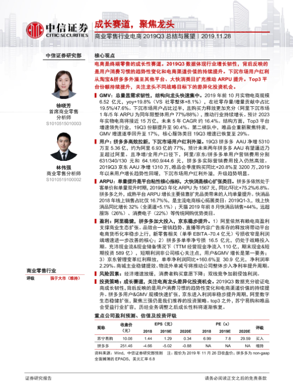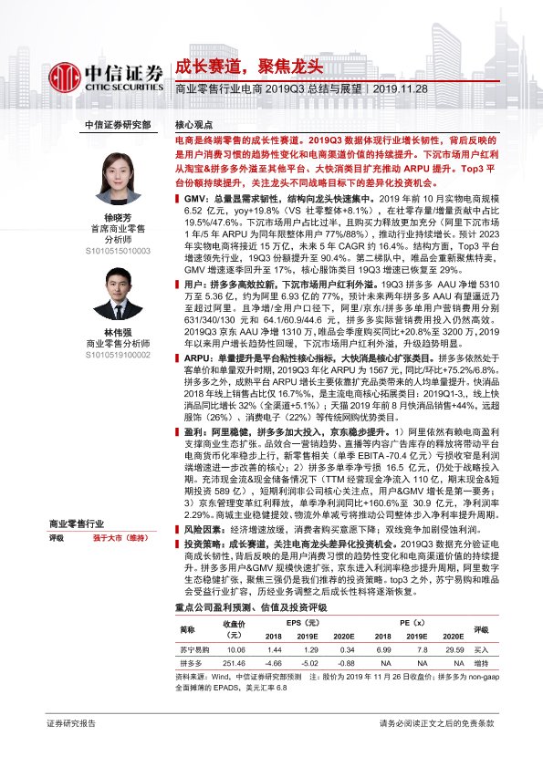 【中信证券】【20191128】商业零售行业电商2019Q3总结与展望:成长赛道,聚焦龙头-19页