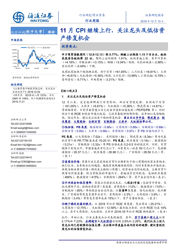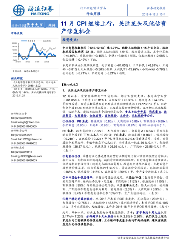 【海通证券】【20191215】商业贸易行业周报:11月CPI继续上行,关注龙头及低估资产修复机会-8页