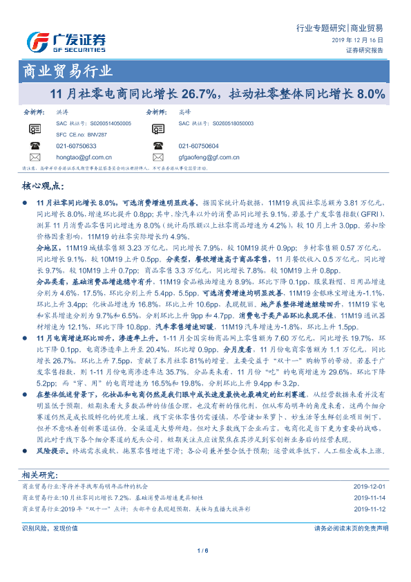 【广发证券】【20191216】11月社零电商同比增长26.7%,拉动社零整体同比增长8.0%-6页