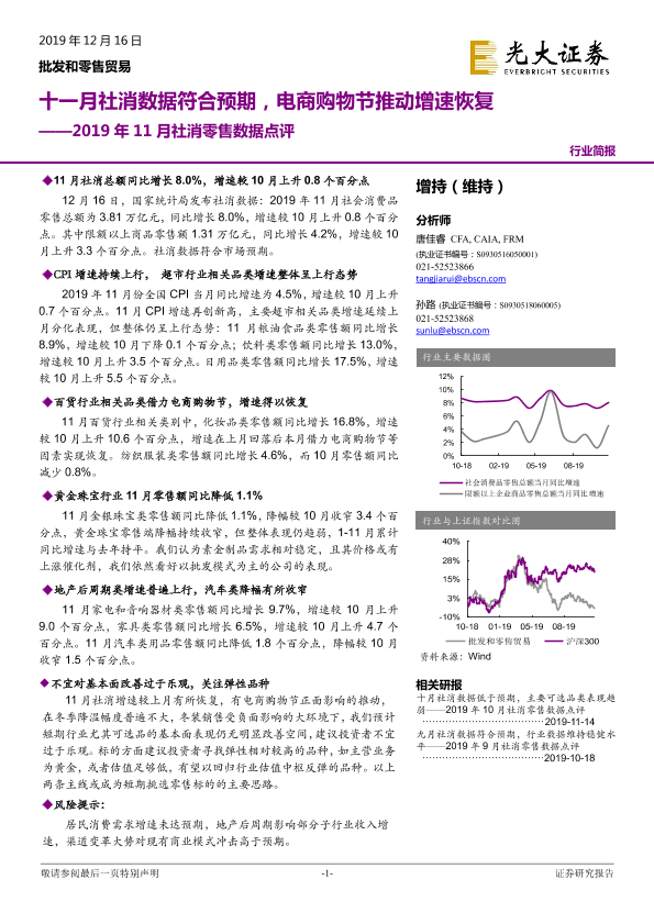 【光大证券】【20191216】2019年11月社消零售数据点评:十一月社消数据符合预期,电商购物节推动增速恢复-6页