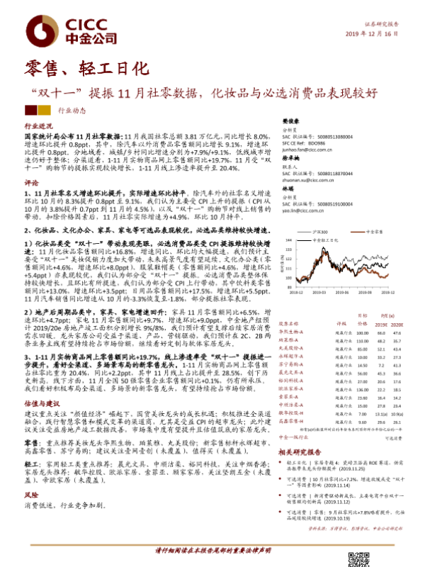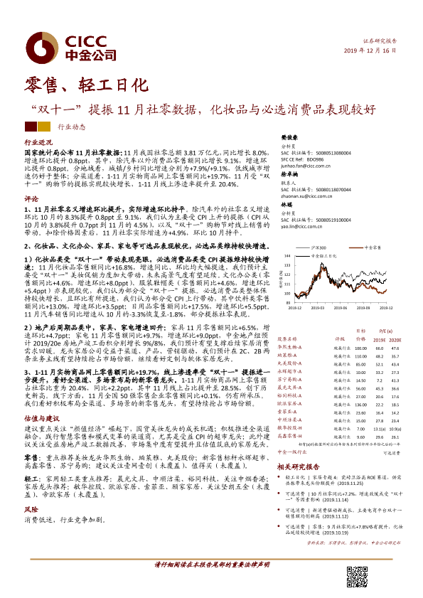 【中金公司】【20191216】零售、轻工日化:“双十一”提振11月社零数据,化妆品与必选消费品表现较好-9页