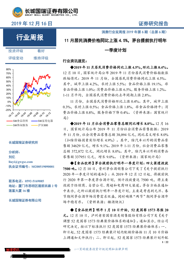 【长城国瑞证券】【20191216】消费行业双周报2019年第6期:11月居民消费价格同比上涨4.5%,茅台提前执行明年一季度计划-22页