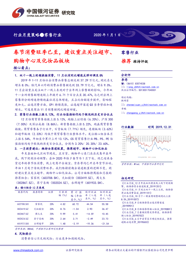 【银河证券】【20200101】零售行业月度策略:春节消费旺季已至,建议重点关注超市、购物中心及化妆品板块-19页