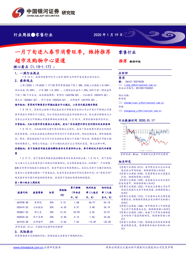 【银河证券】【20200119】零售行业周报:一月下旬进入春节消费旺季,维持推荐超市及购物中心渠道-30页