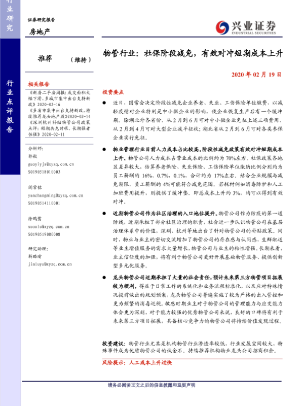 【兴业证券】【20200219】物管行业:社保阶段减免,有效对冲短期成本上升-2页