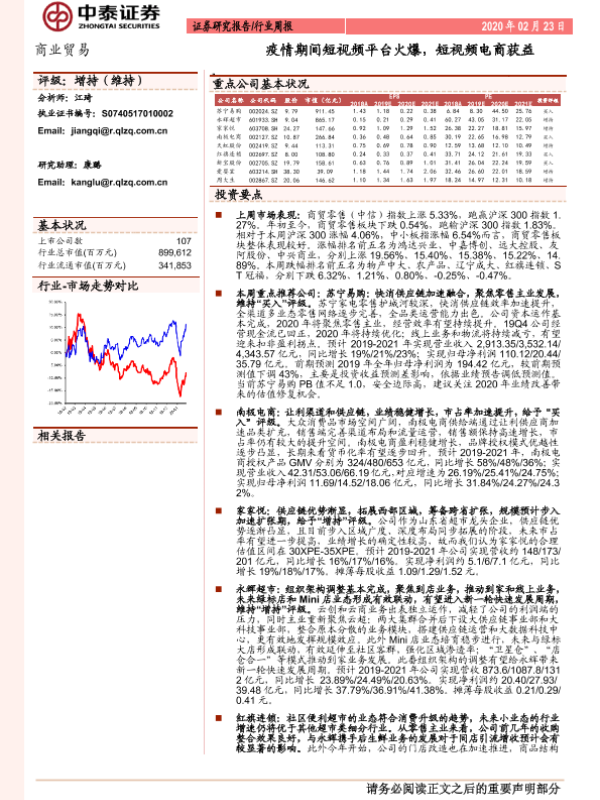 【中泰证券】【20200223】商业贸易行业周报:疫情期间短视频平台火爆,短视频电商获益-13页
