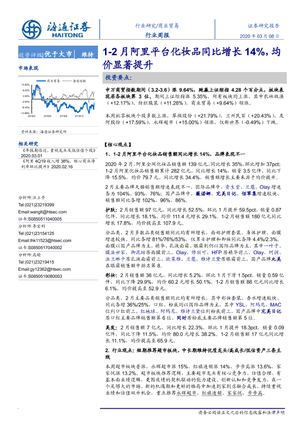 【海通证券】【20200308】商业贸易行业周报:1-2月阿里平台化妆品同比增长14%,均价显著提升-7页