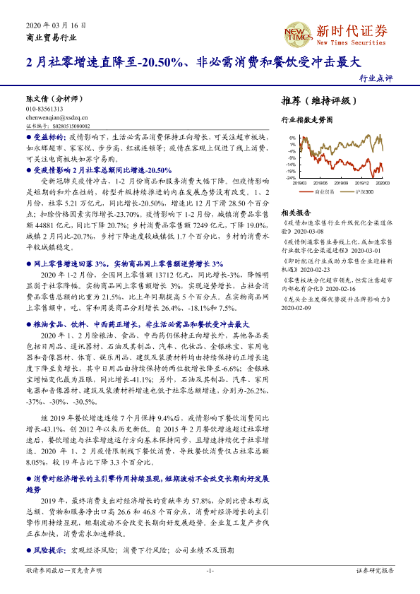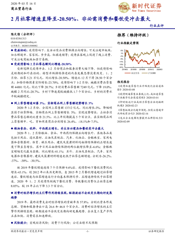 【新时代证券】【20200316】2月社零增速直降至-20.50%、非必需消费和餐饮受冲击最大-15页