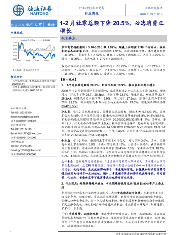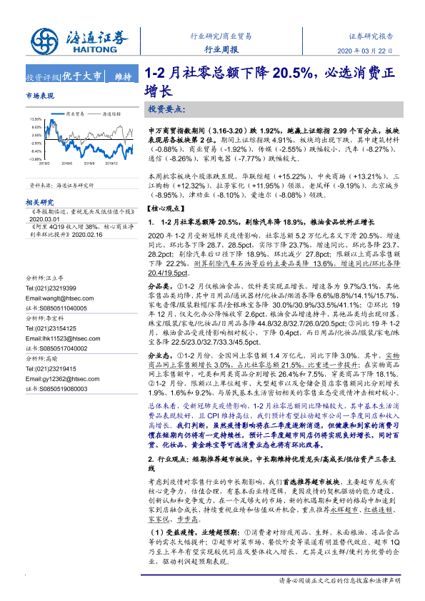 【海通证券】【20200322】商业贸易行业周报:1-2月社零总额下降20.5%,必选消费正增长-5页