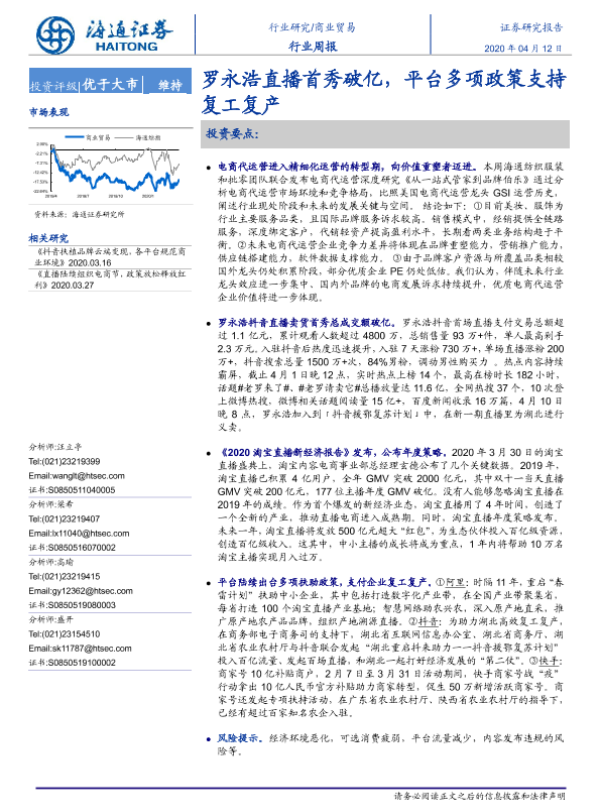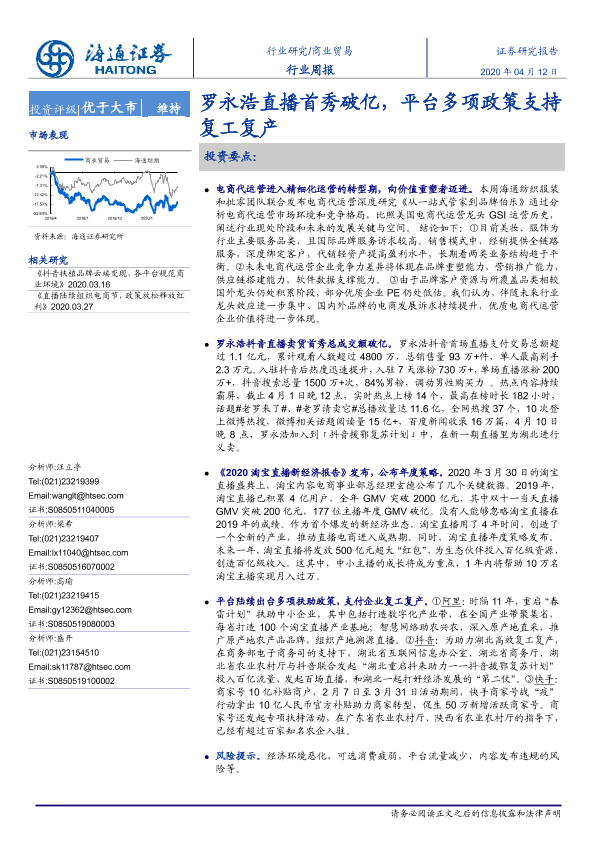 【海通证券】【20200412】商业贸易行业周报:罗永浩直播首秀破亿,平台多项政策支持复工复产-12页