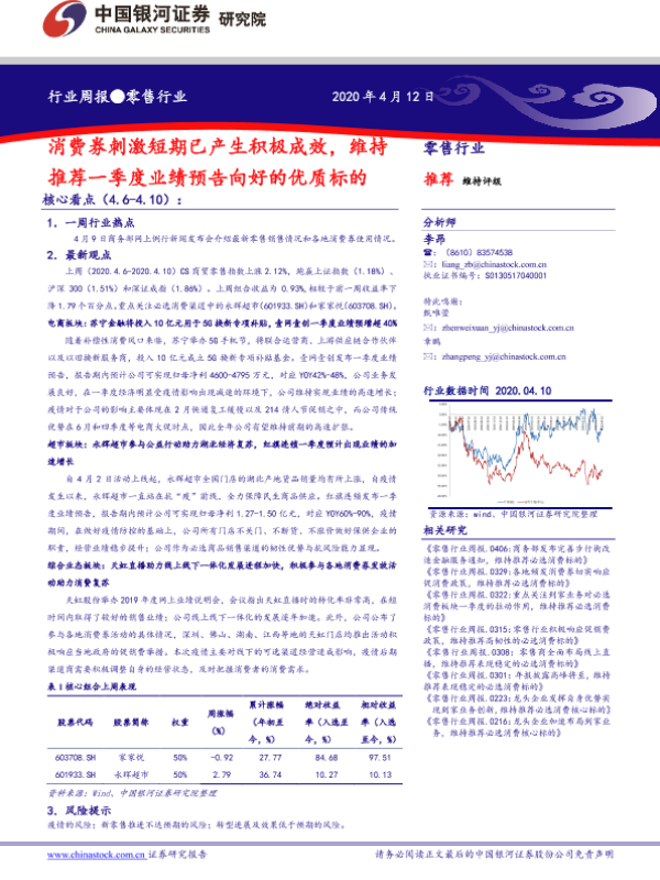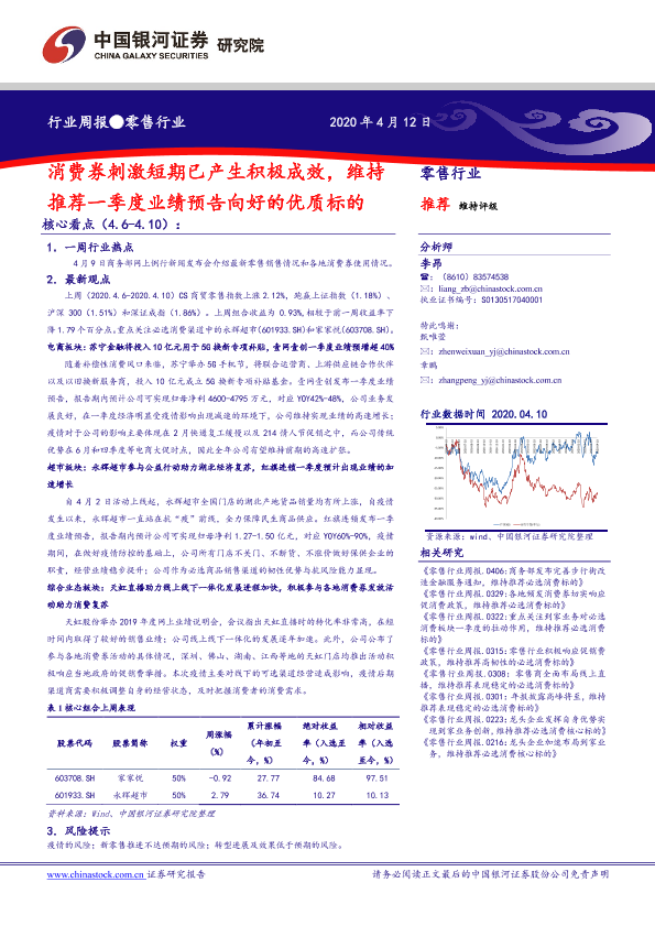 【银河证券】【20200412】零售行业周报:消费券刺激短期已产生积极成效,维持推荐一季度业绩预告向好的优质标的-30页