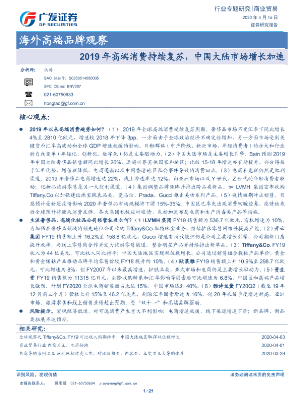 【广发证券】【20200416】海外高端品牌观察:2019年高端消费持续复苏,中国大陆市场增长加速-21页